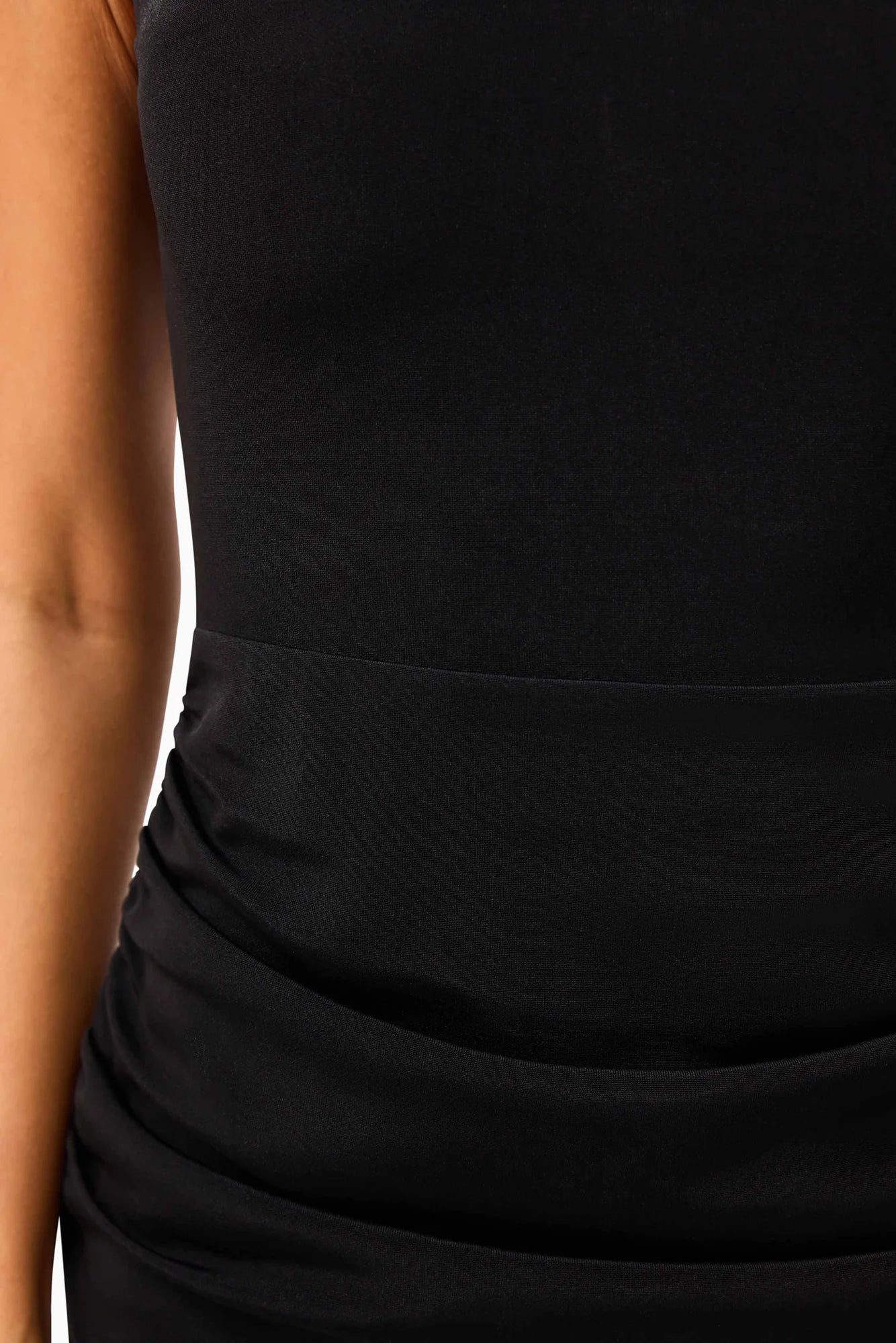 Elevate your formal wardrobe with timeless elegance in the Danica High Neck Gown in Black. Designed to sculpt and flatter, this gown is crafted from a premium drape jersey fabrication that offers stretch and softness in equal measure.
