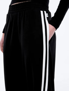 The Valentina Stripe Pant is a contemporary take on the classic track pant. Crafted from a soft stretch jersey fabrication, the pant falls into a wide leg silhouette for a relaxed fit. Featuring a branded elasticated waistband, side seam pockets with invisible zipper closures, the pants boast a placement angled stripe that wraps around the length.