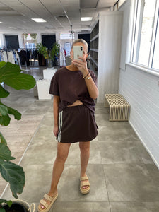 BROWN AND BLACK TEE WITH TUCKED FRONT