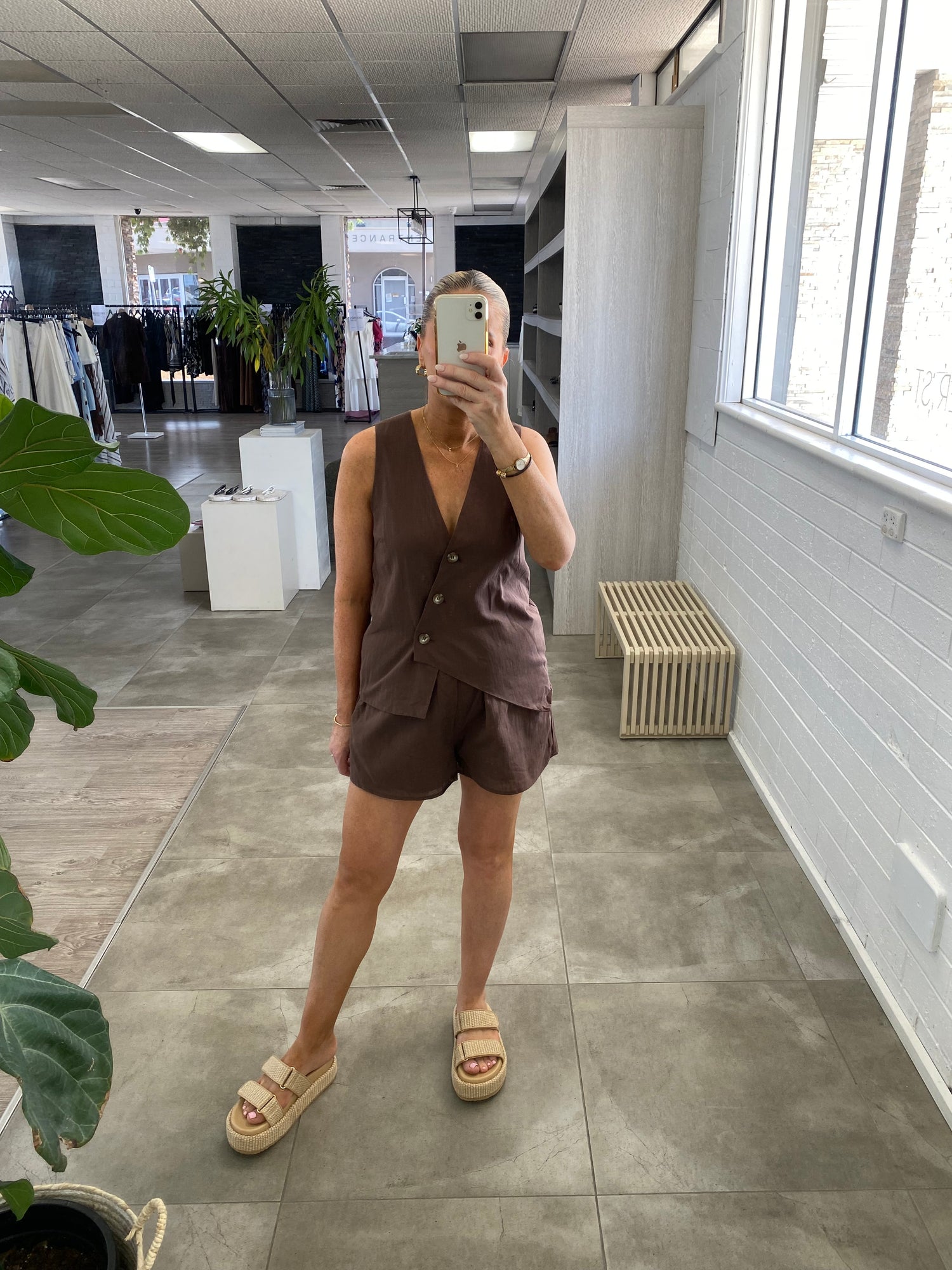 Chocolate vest and elastic shorts