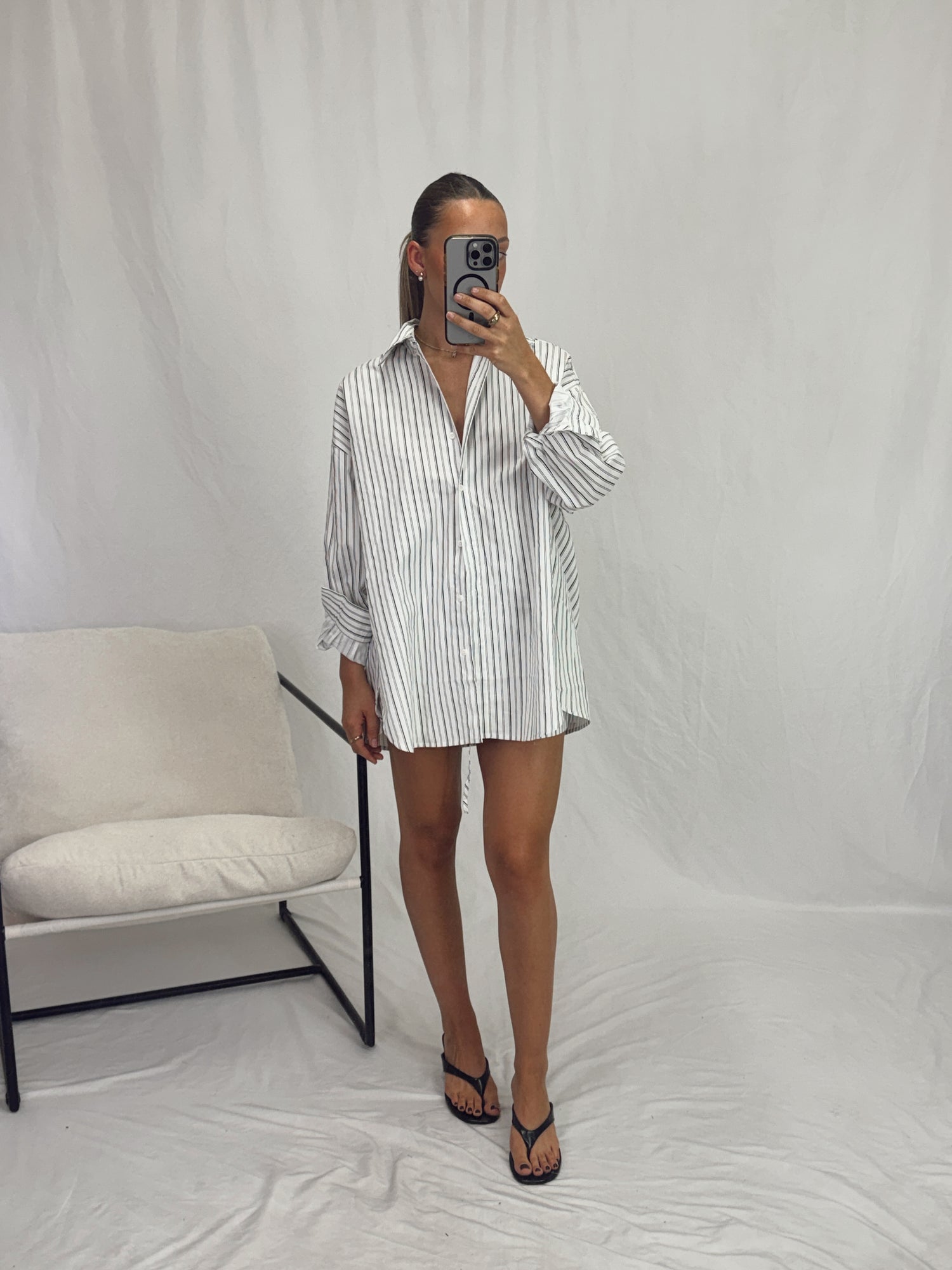 Black and white shirt set with elastic waist shorts.