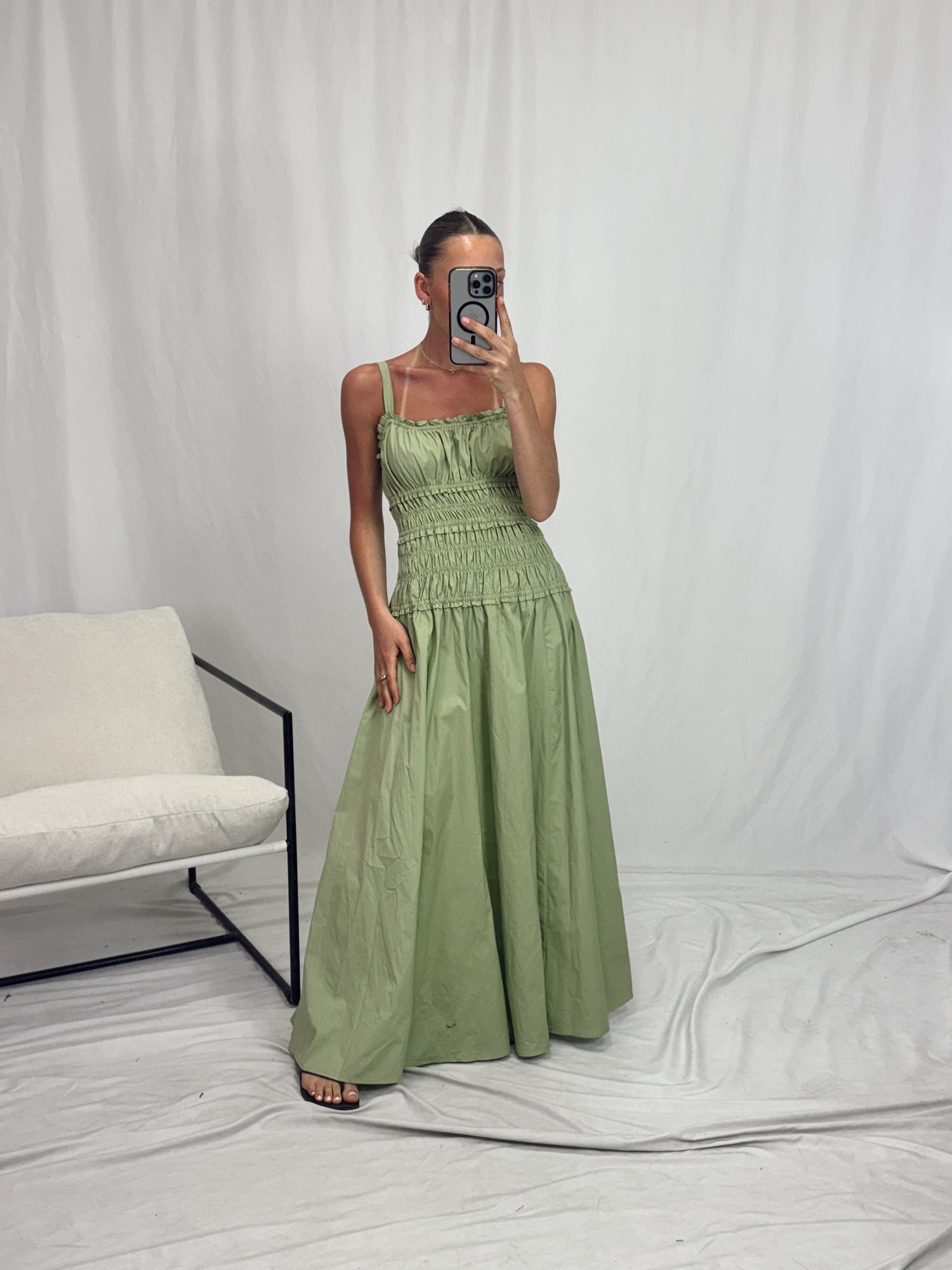 Green dress with elastic detail through the bodice.