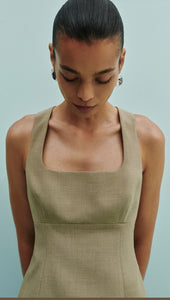 The Thea Top is crafted with a mid weight tailoring fabric and has a smooth, structured hand feel. Designed with a square neckline and fitted bust, this top features a high back with invisible zipper, shaping through body and finishes hip length.