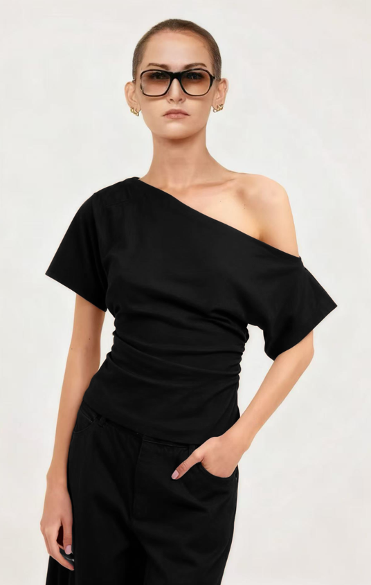Black rouched off shoulder top.
