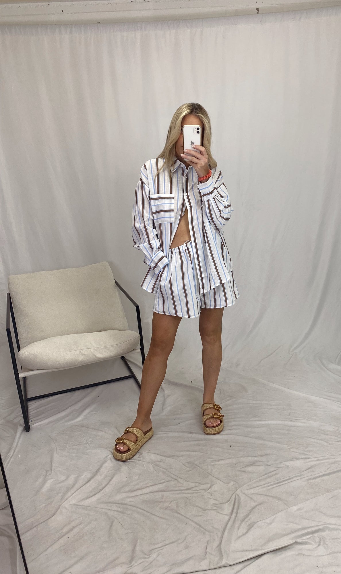 Stripe short with matching elastic waist shorts.