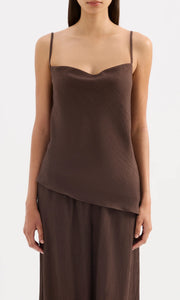 The Winfield Cami is made from a crinkle textured fabric which has a dry, lightweight hand feel. Cut on the bias, this silhouette drapes over the body softly and finishes below the hip. Features include a soft cowl neckline, thin adjustable straps and an asymmetrical hem with side seam slits.