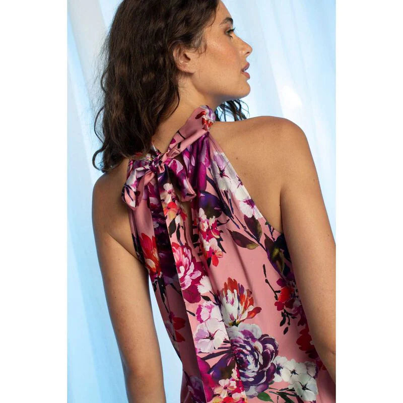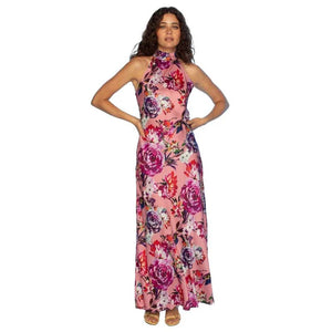 Introducing the Sofia Maxi Dress is a stunning halter style that ties at the back, paired with a hidden zipper for a sleek finish. This sleeveless dress comes in a pink hue, covered with floral prints that add the perfect touch of romance.