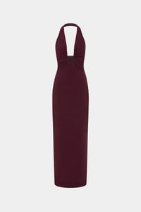 Boned bust cutout-Side split on left side seam-Halter neckline-Back princess seams for shaping-Slim fitting maxi dress