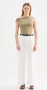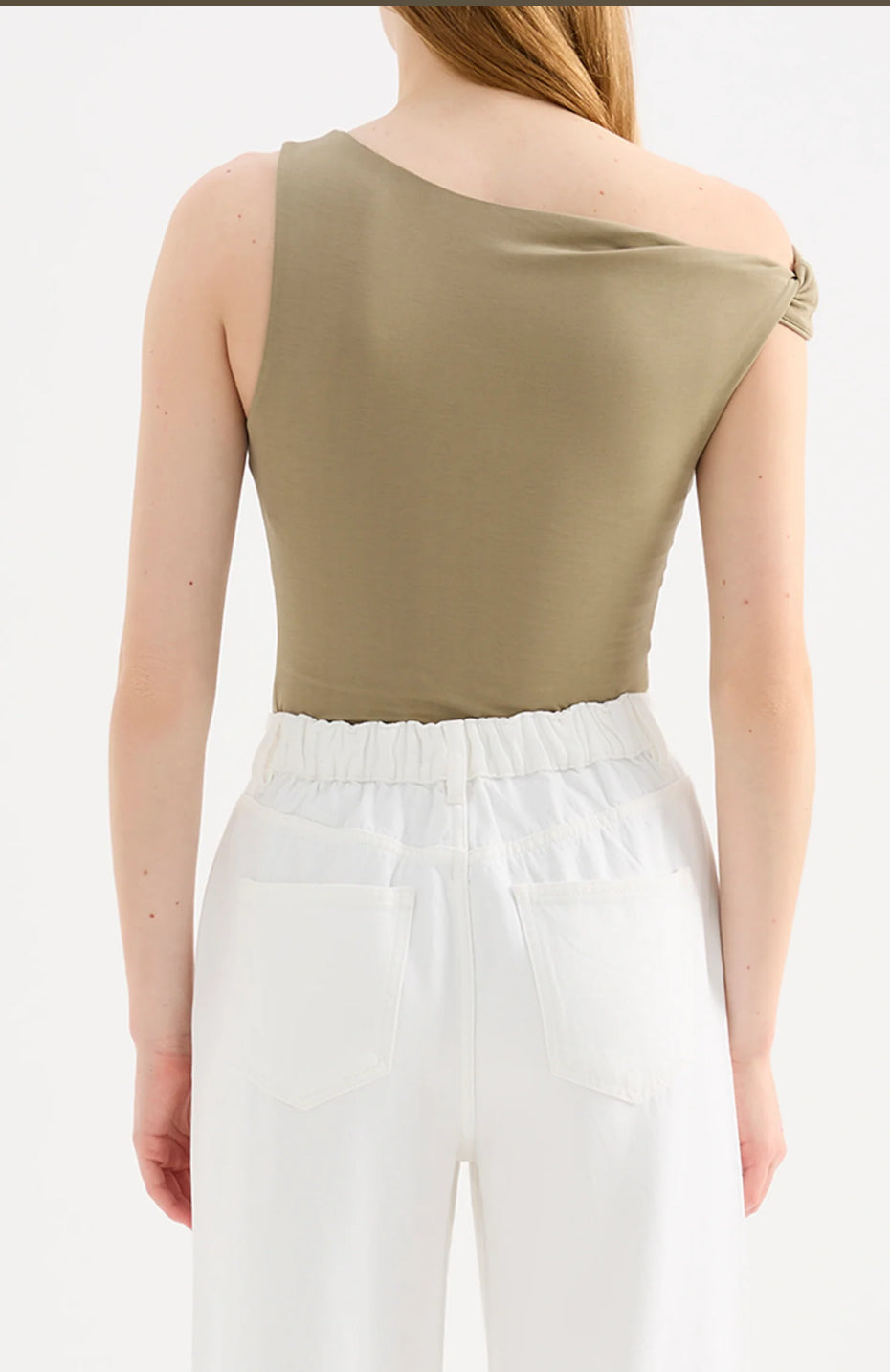 The Chelsea Top is made from a midweight modal fabrication which has a soft, slinky hand feel. The silhouette is a flattering close and finishes at the hips. Features include an asymmetric neckline, with a twist on the off shoulder sleeve.