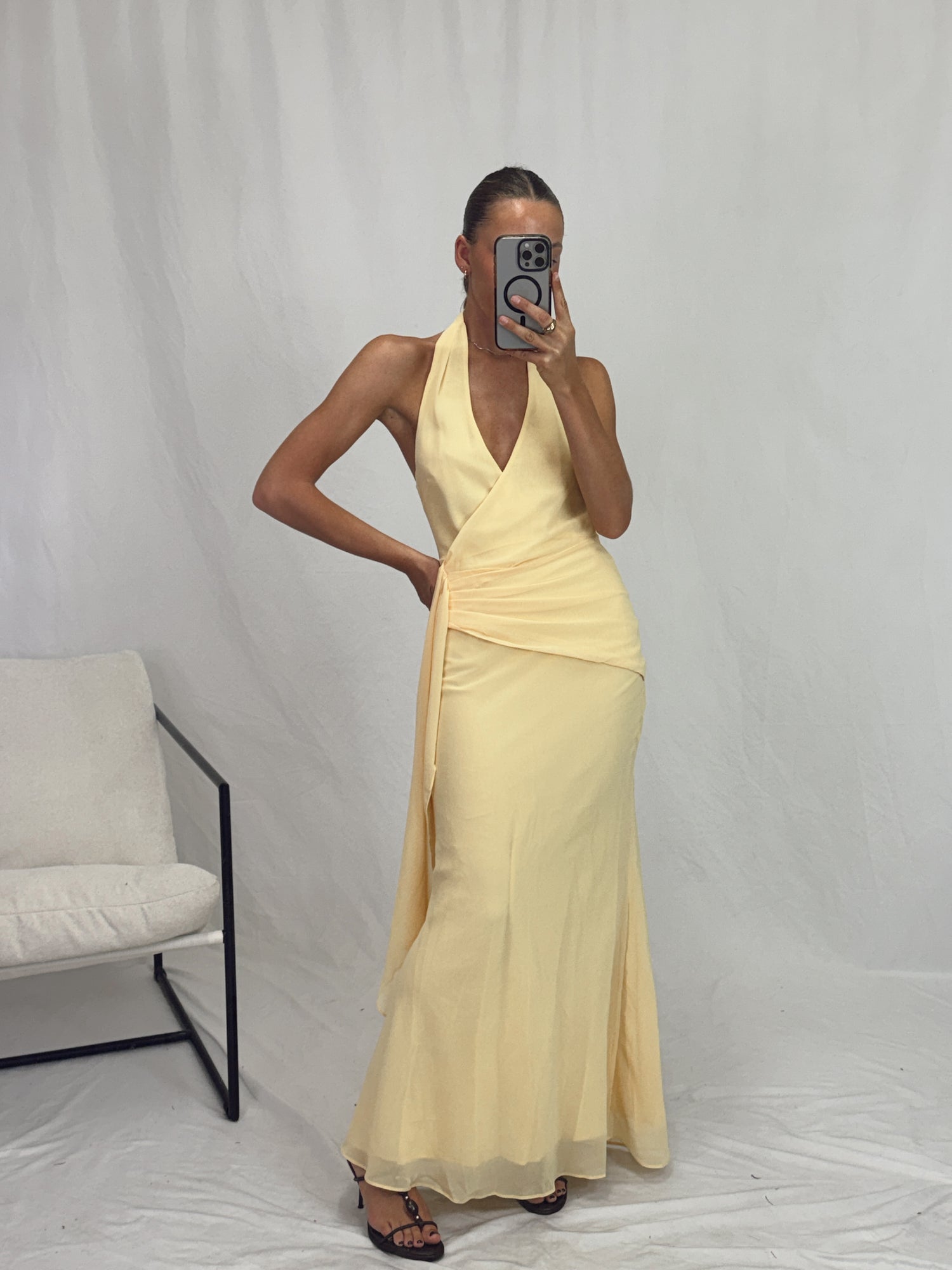 Yellow halter neck dress.